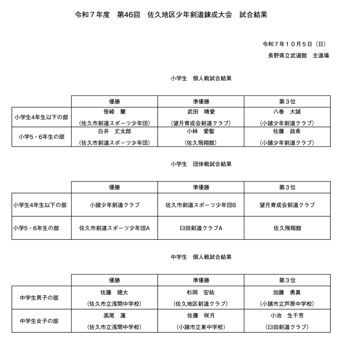 【結果】第46回 佐久地区少年剣道錬成大会(2025/10/05)