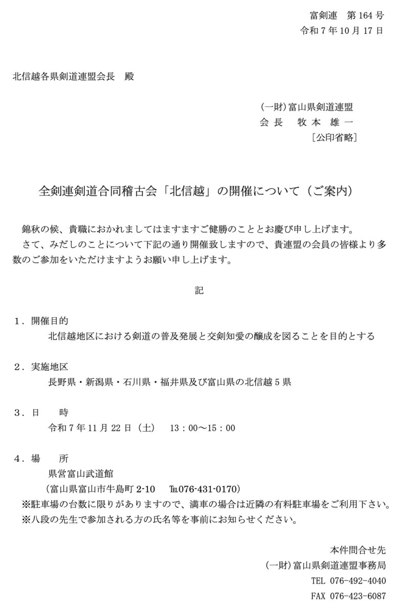【ご案内】11/22 全日本剣道連盟主催(北信越地区)合同稽古会:富山県主催 2025/10/21 最終更新日時 : 2025/10/21 wm 表題の件に関して下記の通りご案内します。 関連資料(PDF) 全日本剣道連盟主催(北信越地区)合同稽古会の実施について(案内)