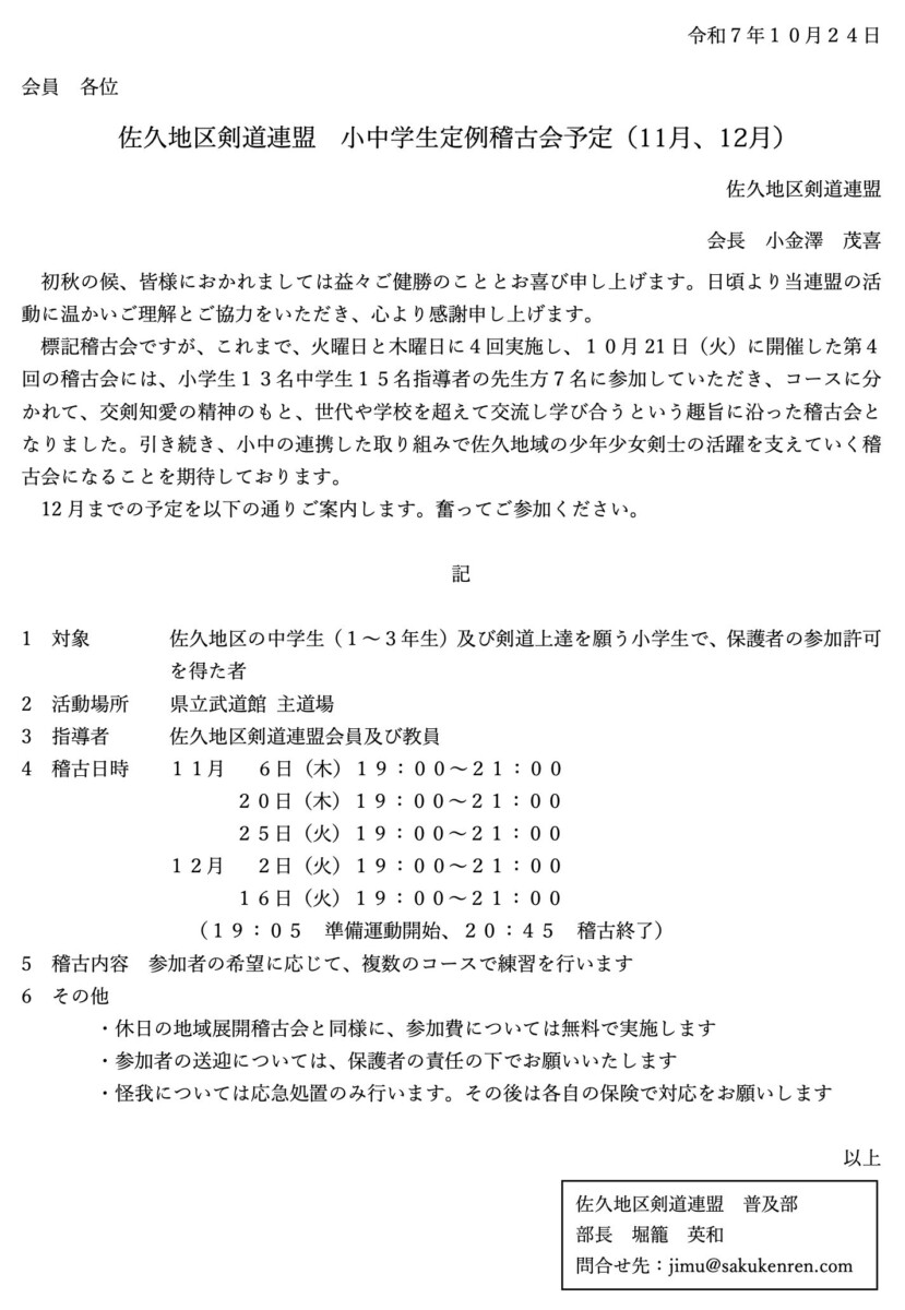 5. 【ご案内】佐久地区剣道連盟 ⼩中学⽣定例稽古会(11月、12月)