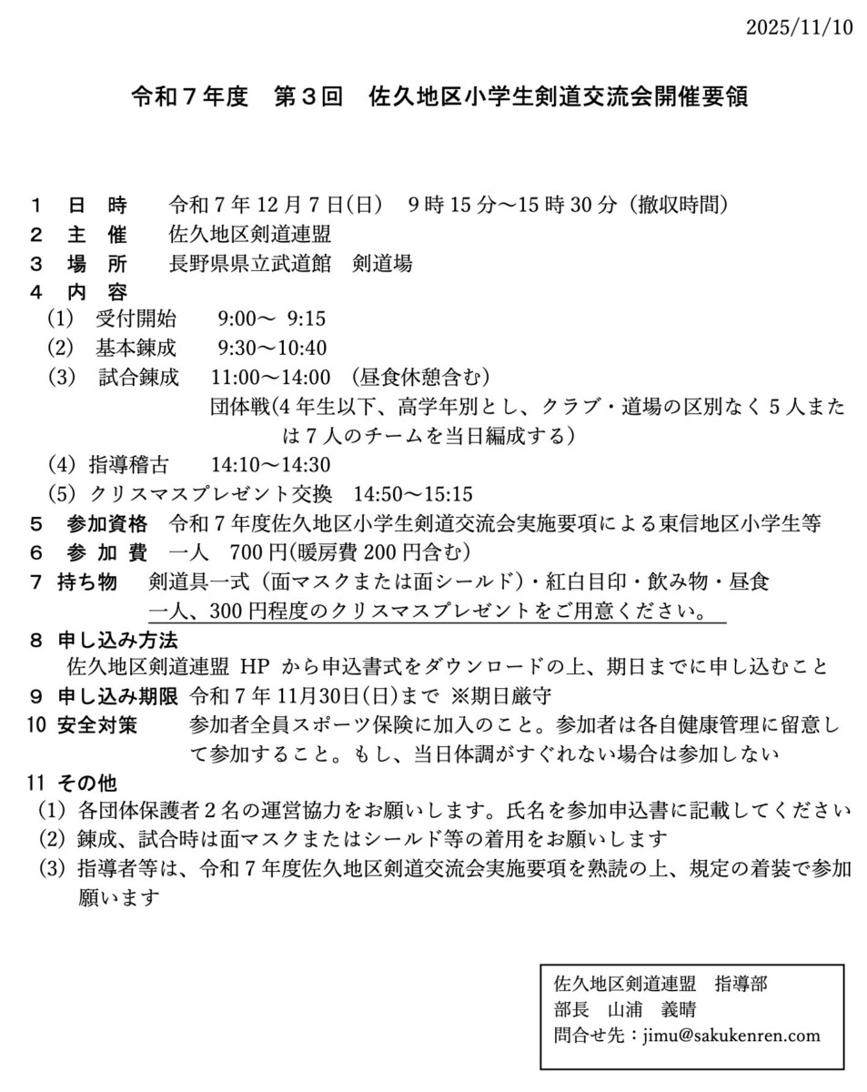 【ご案内】12/7 令和7年度 第3回佐久地区小学生剣道交流会