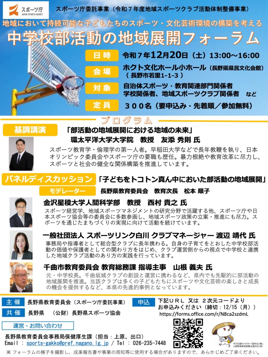 【ご案内】12/20 長野県スポーツ協会:中学校部活動の地域展開フォーラム
