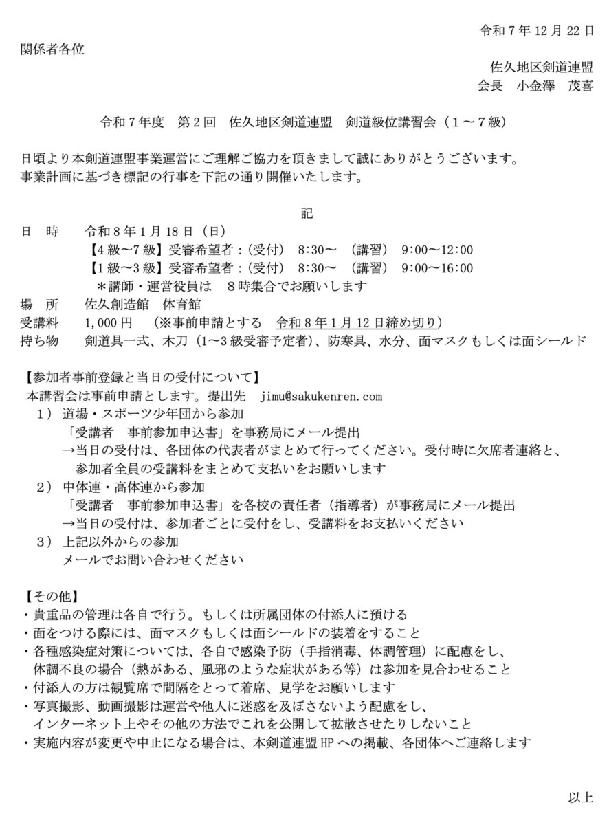 【ご案内】1/18 佐久地区剣道連盟 第2回級位講習会(1-7級)事前申し込み