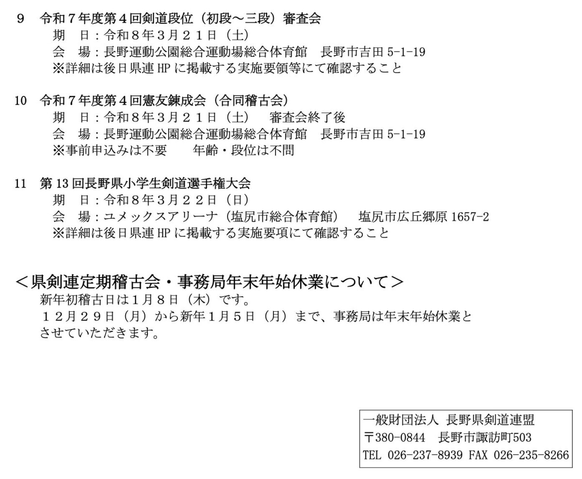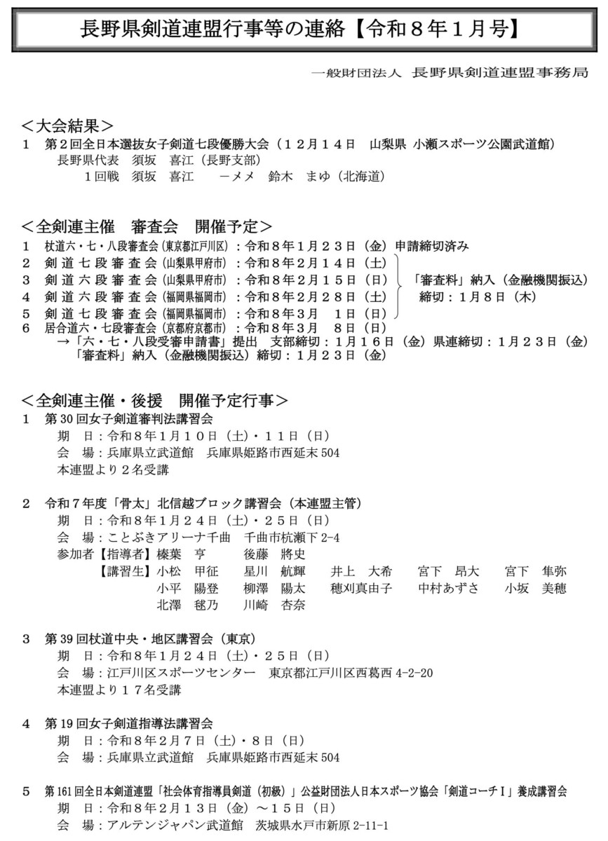 長野県剣道連盟行事等の連絡 1月号 (2026)
