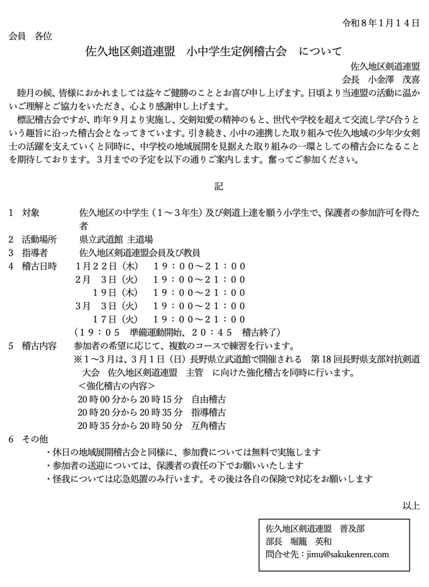 【ご案内】佐久地区剣道連盟 ⼩中学⽣定例稽古会(1月-3月) 2026/01/14 最終更新日時 : 2026/01/14 wm 関連書類(PDF) 佐久地区剣道連盟 ⼩中学⽣定例稽古会 (1月-3月)