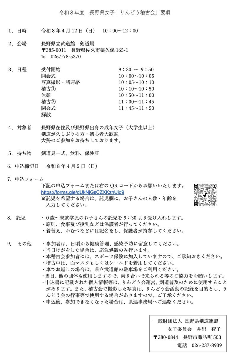 【ご案内】4/12 令和8年度 長野県女子「りんどう稽古会」 2026/03/03 最終更新日時 : 2026/03/03 wm 表題の件に関して下記の通りご案内します。 参加希望者は開催要項を確認の上、令和8年4月5日までに要項にある申込みフォームからお申し込みください。 関連資料(PDF) 令和8年度 長野県女子「りんどう稽古会」要項 申込みフォームリンク [Google form] ※長野県剣道連盟