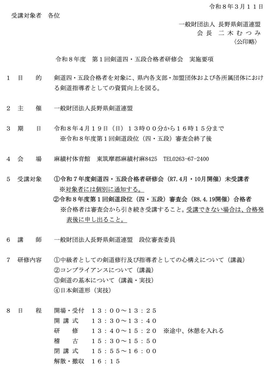 5. 【ご案内】4/19 令和8年度 第1回剣道四・五段合格者研修会