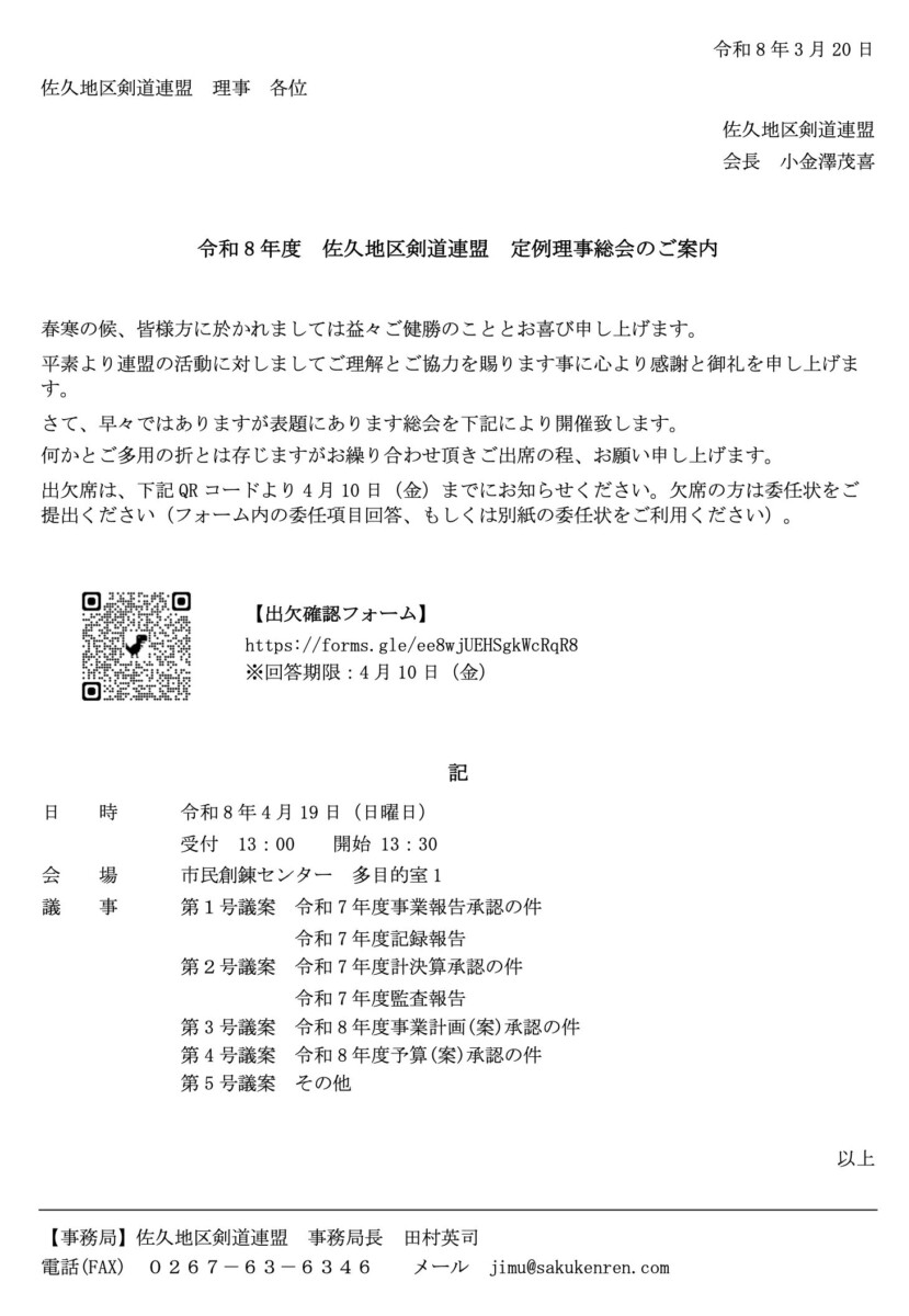 【ご案内】4/19 令和8年度 佐久地区剣道連盟 定例理事総会 2026/03/20 最終更新日時 : 2026/03/20 wm 関連資料 令和8年度 佐久地区剣道連盟 定例理事総会のご案内 出欠確認フォーム [Google form] 理事会欠席時の委任状 [書面提出用]