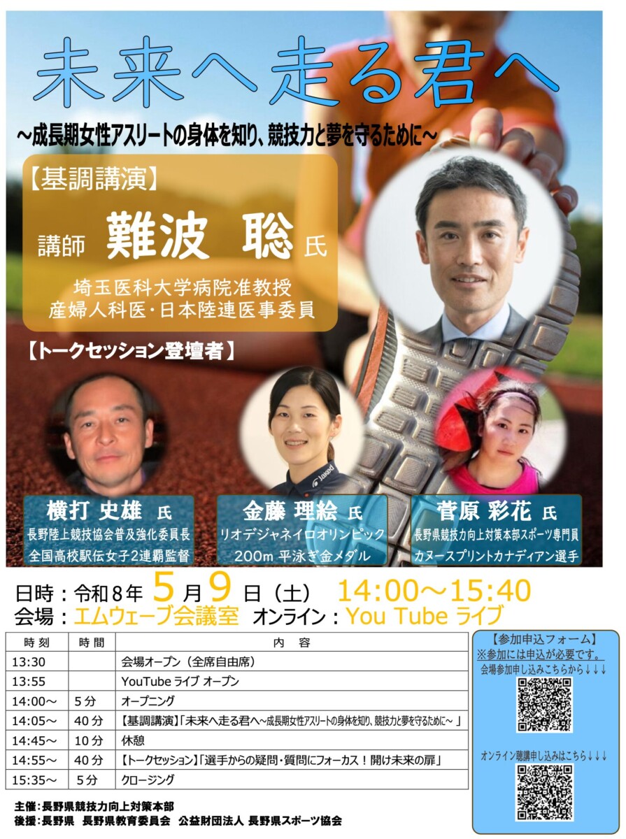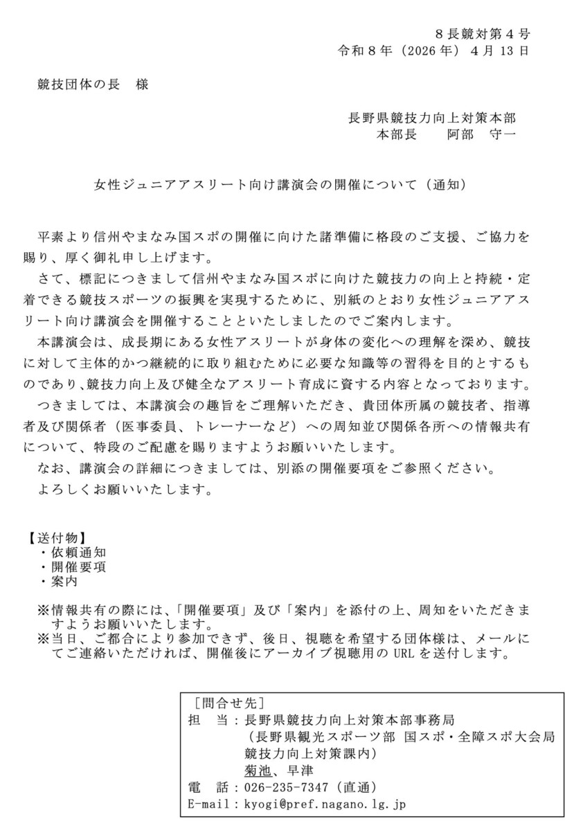 【お知らせ】女性ジュニアアスリート向け講演会の開催について 2026/04/14 最終更新日時 : 2026/04/14 wm 表題の件について連絡がありましたので、お知らせします。詳しくは資料をご確認ください。 関連資料(PDF) 案内.pdf 開催通知(競技団体様).pdf 女性ジュニアアスリート向け講演会開催要項.pdf