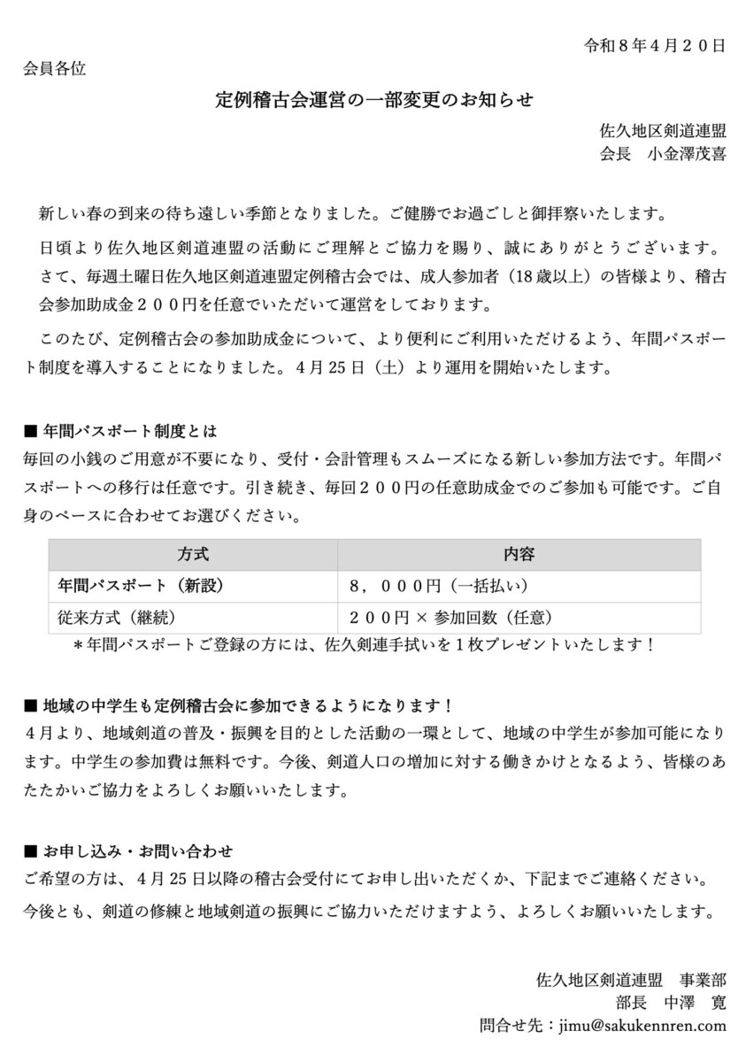 【定例稽古会】年間パスポート導入と中学生参加可能になりました!