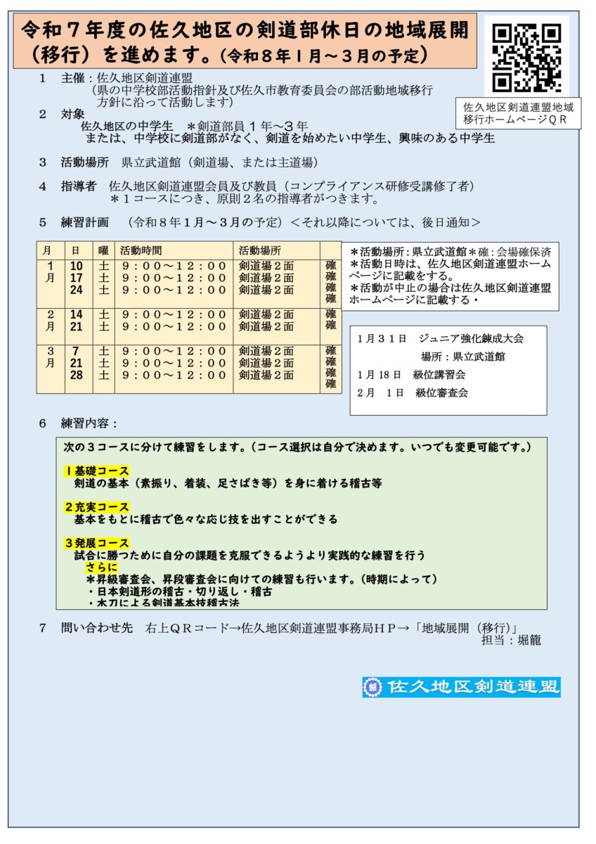 佐久地区剣道連盟 ⼩中学⽣定例稽古会(1月-3月)を掲載しました【→詳細】