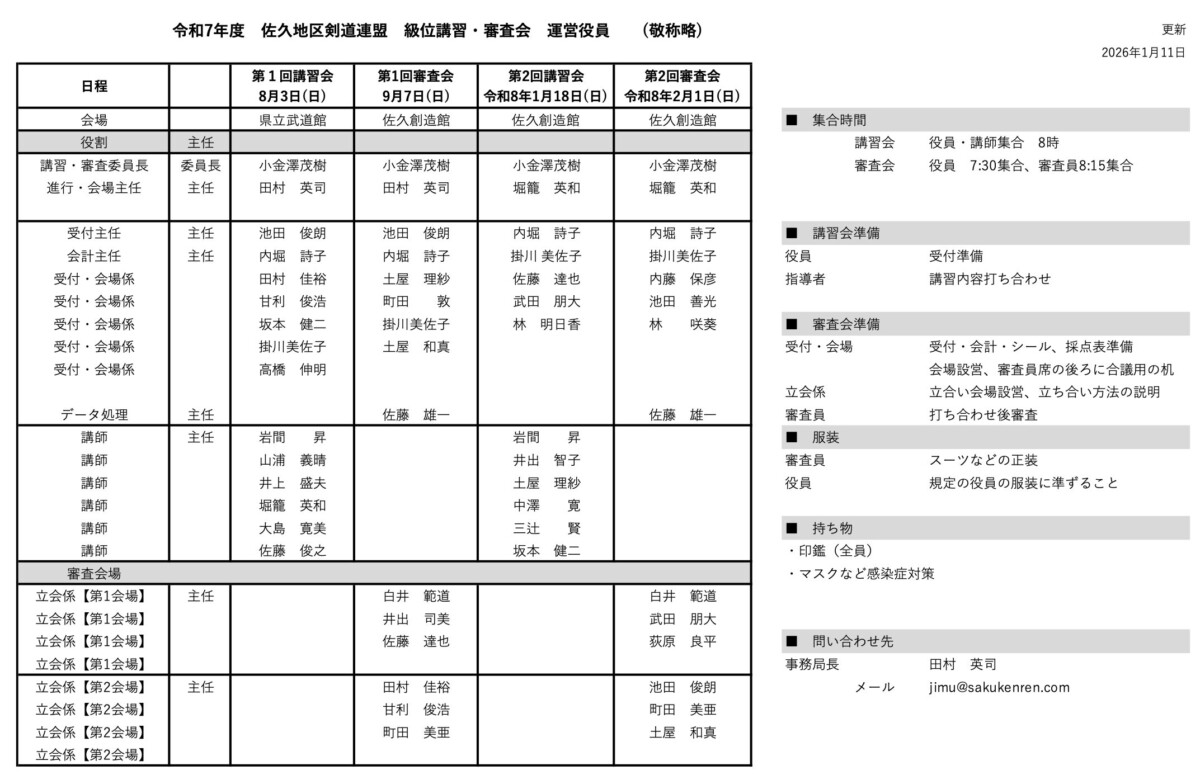令和7年度 佐久地区剣道連盟 級位講習会・全級位審査会 運営役員表